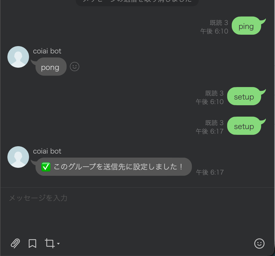 • LINEグループで setup とメッセージする → 送信先グループIDを取得して保存