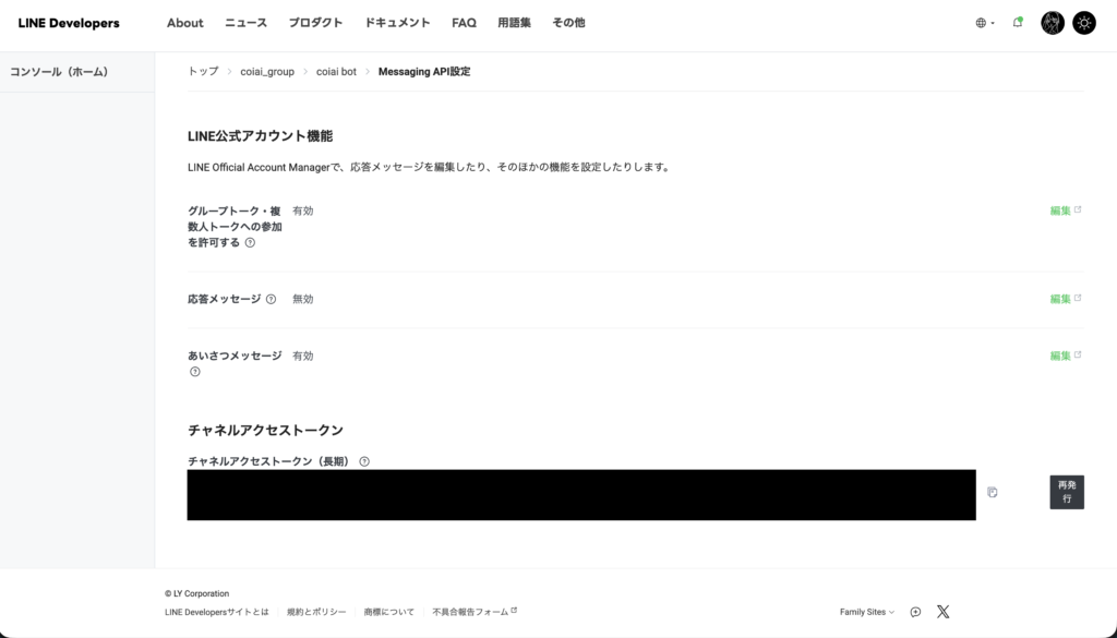 • LINE_ACCESS_TOKEN:長期チャネルアクセストークン(Messaging API)