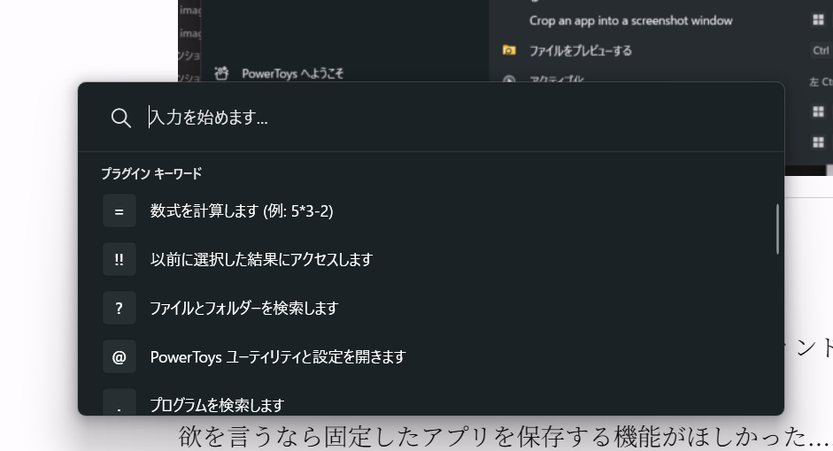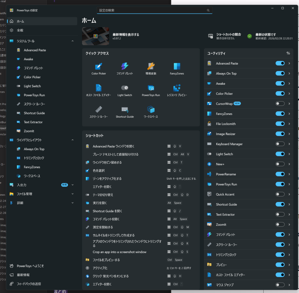 Win 長押しで使えるショートカット一覧を表示PowerToysは「Windowsにこの機能なんで標準で入ってないの?」を全部解決してくれるツール集。入れておいて損はない。特に FancyZones、PowerToys Run、Text Extractor の3つは一度使うと戻れなくなる。
