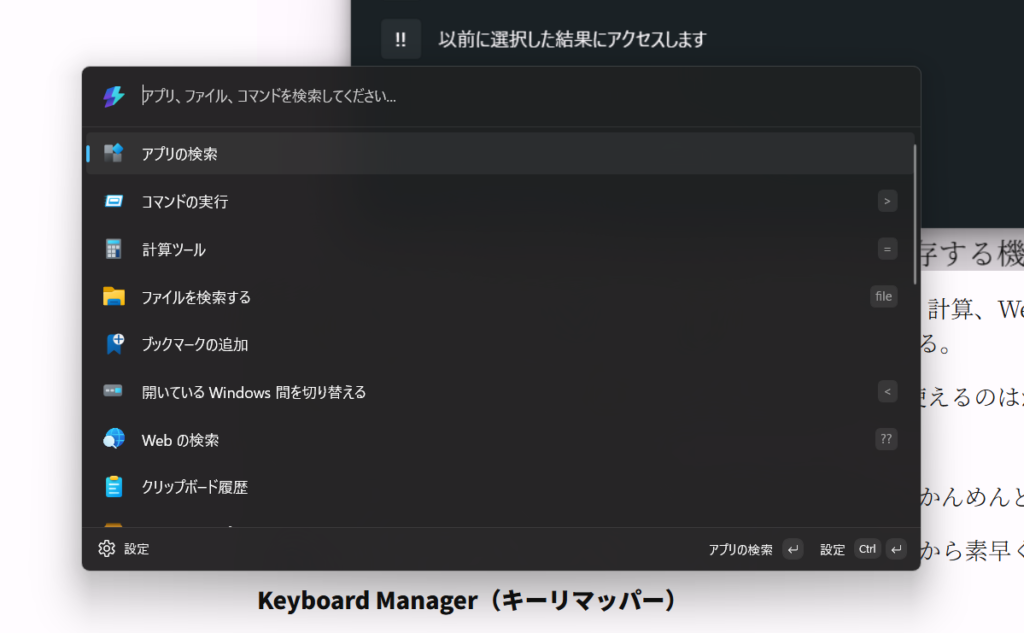 Alt + Space でどこからでも起動。アプリ検索、ファイル検索、計算、Web検索、シェルコマンド実行など、プラグインで拡張可能。macOSのSpotlightやAlfredに相当する機能がWindowsで使える。