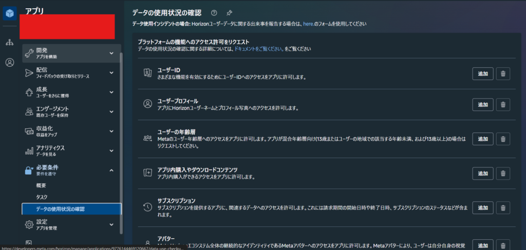 左メニューの必要条件の中のデータ使用状況の確認を開きます。